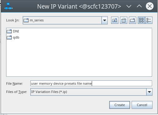 - In the IP parameter editor, provide an entity name for the memory device presets file (the name that you provide here becomes the file name for the file) and specify a directory. Click Create.