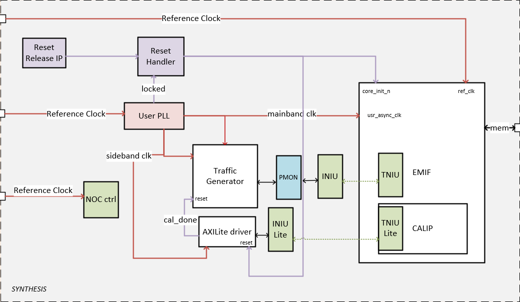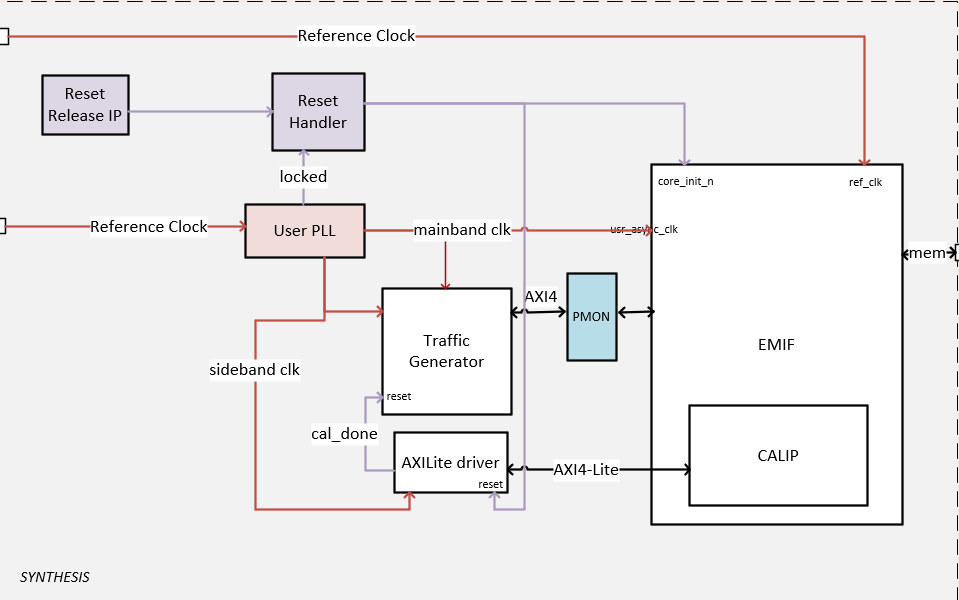- A traffic generator, which is a synthesizable AXI4 driver that implements a hard-coded pattern. The traffic generator also monitors the data read from the memory to ensure it matches the written data and asserts a failure otherwise.