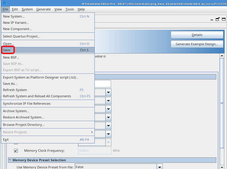 - If you are implementing a single interface example design, configure the EMIF IP and click File > Save to save the current settings into the IP variation file (<user instance name>.ip).