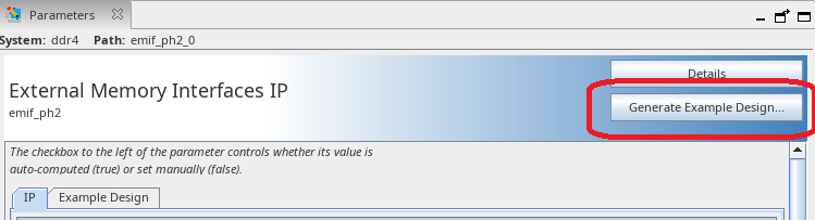 - If you have generated a design example and then make changes to it in the parameter editor, you must regenerate the design example to see your changes implemented. The newly generated design example does not overwrite the existing design example files.