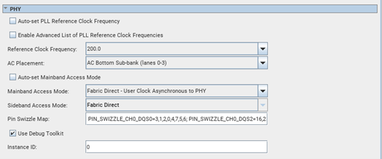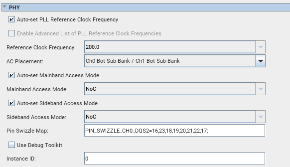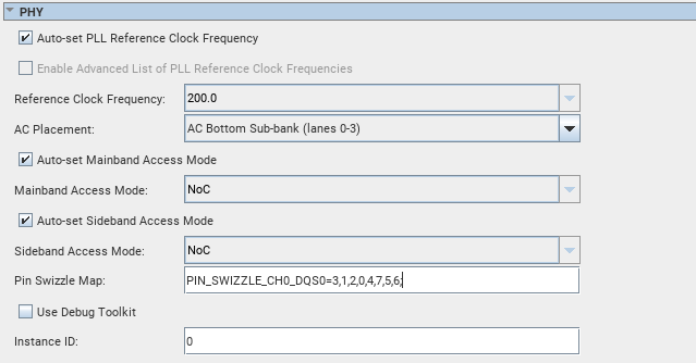To achieve this swizzling in DQS Group 2, you must enter PIN_SWIZZLE_CH0_DQS2=16,23,18,19,20,21,22,17; in the Pin Swizzle Map field of the PHY section of the High-level Configuration tab in the parameter editor.