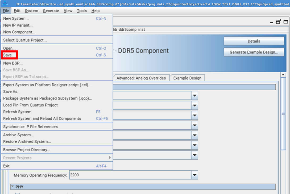 - If you are implementing a single interface example design, configure the EMIF IP and click File > Save to save the current settings into the IP variation file (<user instance name>.ip).