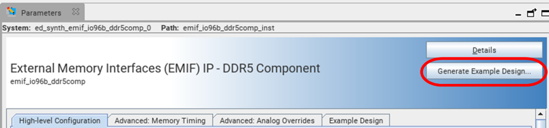 - If you have generated a design example and then make changes to it in the parameter editor, you must regenerate the design example to see your changes implemented. The newly generated design example does not overwrite the existing design example files.