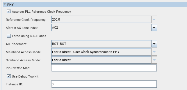 | PHY |   Select the desired mode to connect the EMIF IP to user logic: