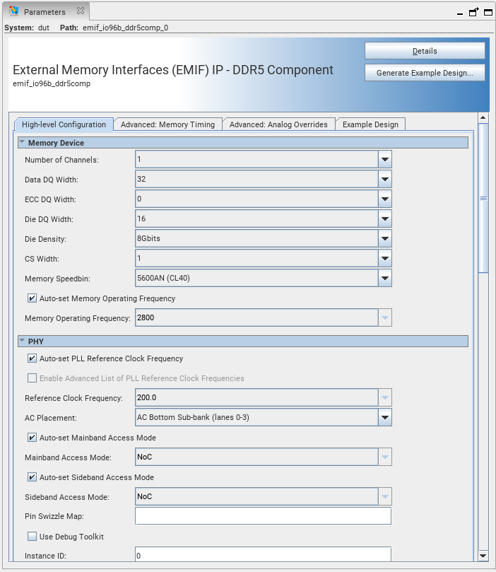 | Example Design | The Example Design tab lets you select which HDL to use for the top-level files, and which file sets you want the design example to generate. You can also enable the performance monitor and modify the length traffic for the traffic generator. You should make these selections before clicking the Generate Example Design... button. The generated design example is a complete EMIF system consisting of the EMIF IP and a driver that generates random traffic to validate the memory interface. |