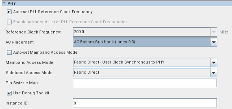 | PHY | Select the desired mode to connect the EMIF IP to user logic: