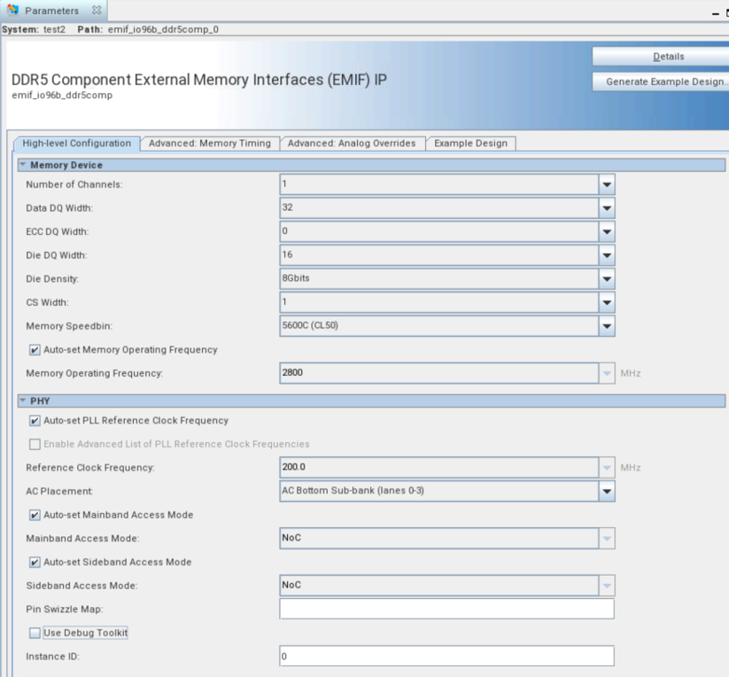 | Example Design | The Example Design tab lets you select which HDL to use for the top-level files, and which file sets you want the design example to generate. You can also enable the performance monitor and modify the length traffic for the traffic generator. You should make these selections before clicking the Generate Example Design... button. The generated design example is a complete EMIF system consisting of the EMIF IP and a driver that generates random traffic to validate the memory interface. |