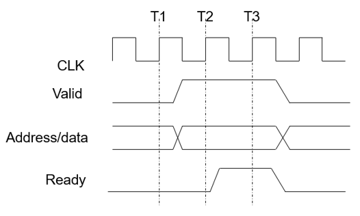 In the figure above, the source presents the address, data or control information after T1 and asserts the VALID signal. The destination asserts the READY signal after T2, and the source must keep its information stable until the transfer occurs at T3, when this assertion occurs. In this example, the source asserts the VALID signal prior to the destination asserting the READY signal. Once the source asserts the VALID signal, it must remain asserted until the handshake occurs, at a rising clock edge at which VALID and READY are both high. Once the destination asserts READY, it can deassert READY before the source asserts VALID. The destination can assert READY whenever it is ready to accept data, or in response to a VALID assertion from the source.