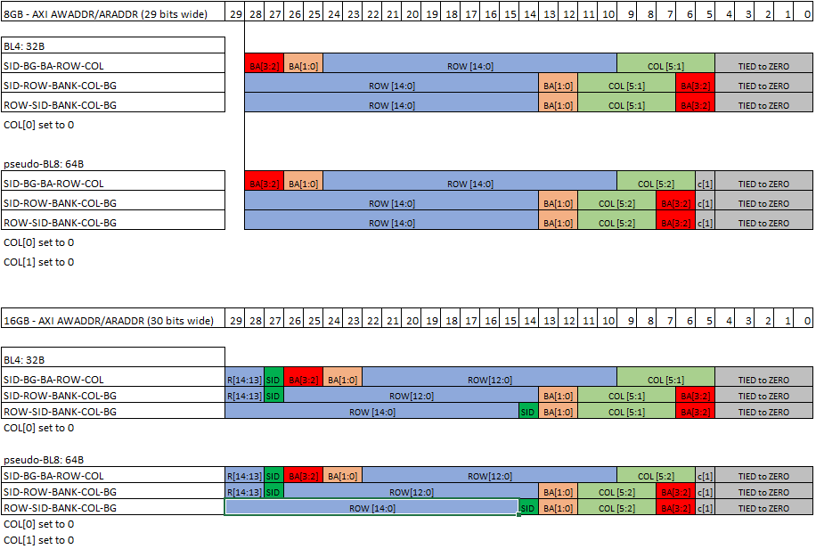 The lower 30 bits of the AXI address identify a location within the targeted pseudo-channel. The HBM2E DRAM addressing consists of the following: