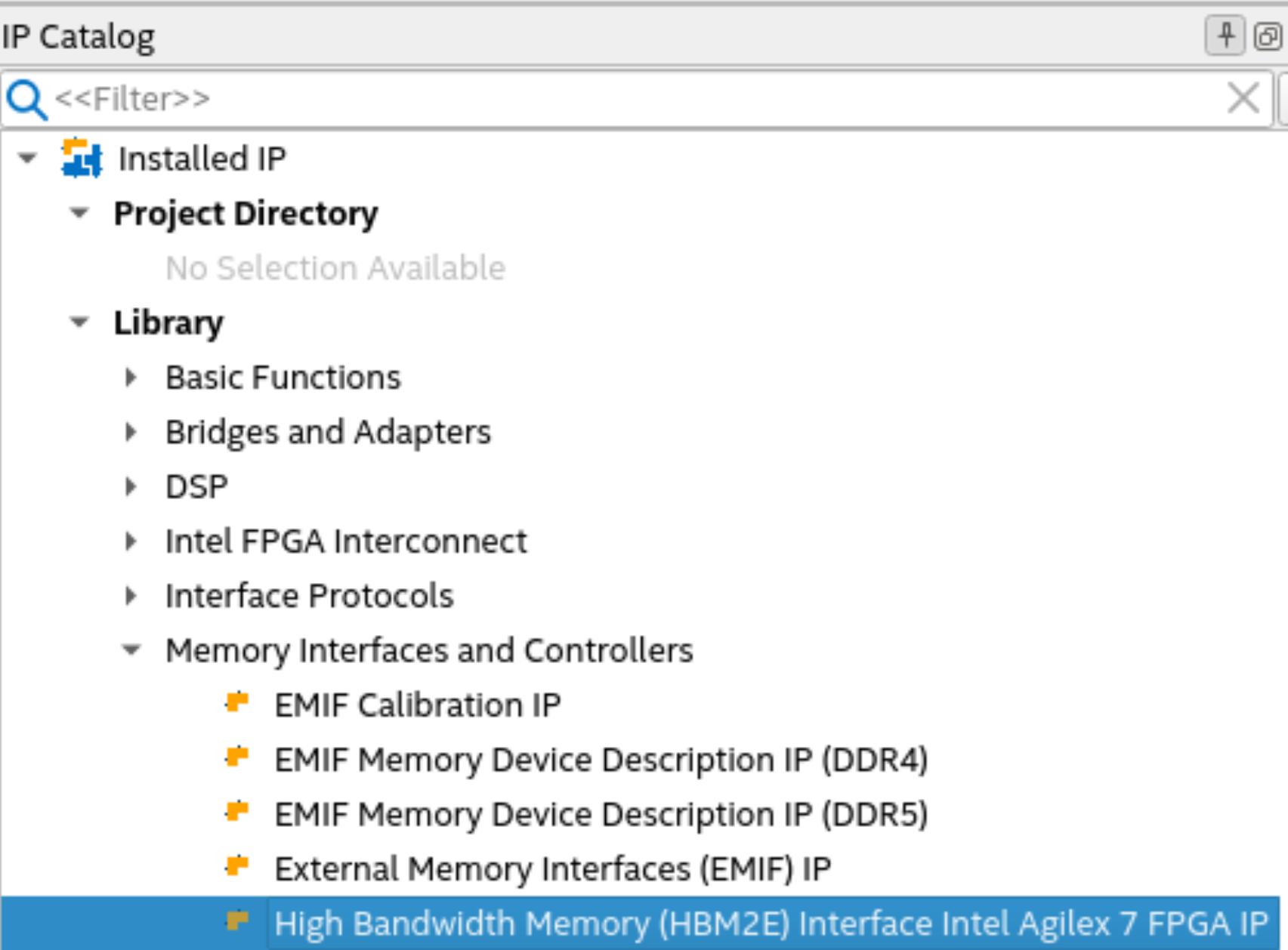 - In the IP Catalog window, select Installed IP > Library > Memory Interfaces and Controllers > High Bandwidth Memory (HBM2E) Interface Agilex™ 7 FPGA IP.