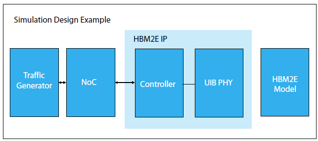 Simulation incorporates abstract models of the NoC and HBM2E memory device. The hardened HBM2E controller is simulated in full, and simulation of the UIB is simplified by omitting the calibration phase. The HBM2E controller converts AXI memory access commands to HBM commands. The universal interface block PHY (UIB PHY) is the physical-layer interface that carries low-level signaling between the controller and HBM2E device.