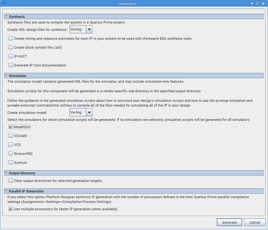 - Under Synthesis, uncheck Create block symbol file (.bsf) and Generate IP core Documentation options.