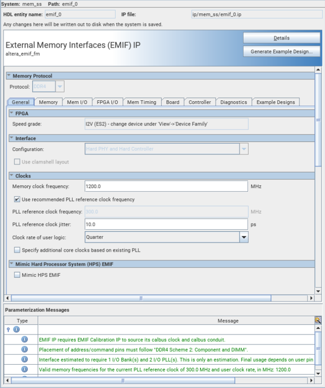 The External Memory Interfaces parameters reside on the Platform Designer window that appears once you parameterize the high-level topology, generate IPs within the memory subsystem, and finally click Dive into Packaged Subsystem.