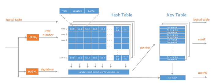 HASH2 is a hash generator that is used to generate a key signature – a compressed representation of a key. The key signature is stored in a bin belonging to a row selected by HASH1 and must be unique within the selected row.