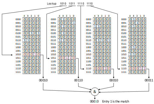 To insert a new entry, a key and mask are needed. The key is first split into a number of chunks. If no bits are masked, then the slice value is used to address a single location and a single bit corresponding to the entry number is set to 1.