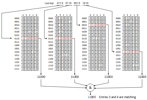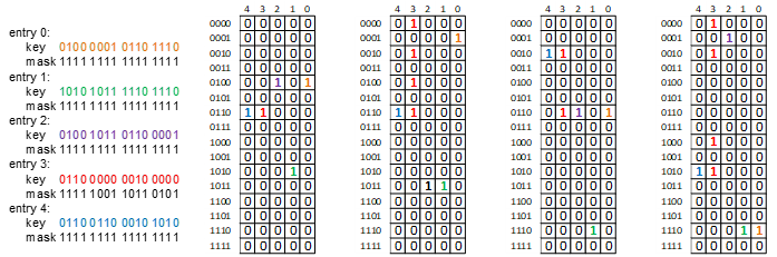 Entries 0, 1, 2 and 4 are expected to match exactly. Entry number 3 has several bits masked out (that is, marked as don’t care by setting the corresponding bit positions to 0.