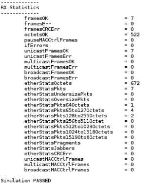 When simulation ends, the values of the MAC statistics counters are displayed in the transcript window. The transcript window also displays PASSED if the RX Avalon® streaming interface of channel 0 received all packets successfully, all statistics error counters are zero, and the RX MAC statistics counters are equal to the TX MAC statistics counters.