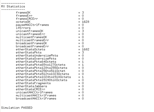 When simulation ends, the values of the MAC statistics counters are displayed in the transcript window. The transcript window also displays PASSED if the RX Avalon® streaming interface of channel 0 received all packets successfully, all statistics error counters are zero, and the RX MAC statistics counters are equal to the TX MAC statistics counters.