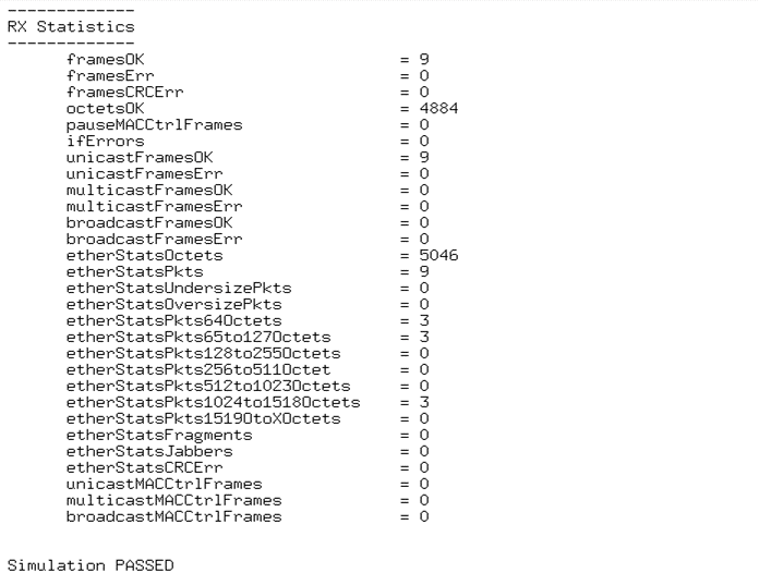 When simulation ends, the values of the MAC statistics counters are displayed in the transcript window. The transcript window also displays PASSED if the RX Avalon® streaming interface of channel 0 received all packets successfully, all statistics error counters are zero, and the RX MAC statistics counters are equal to the TX MAC statistics counters.