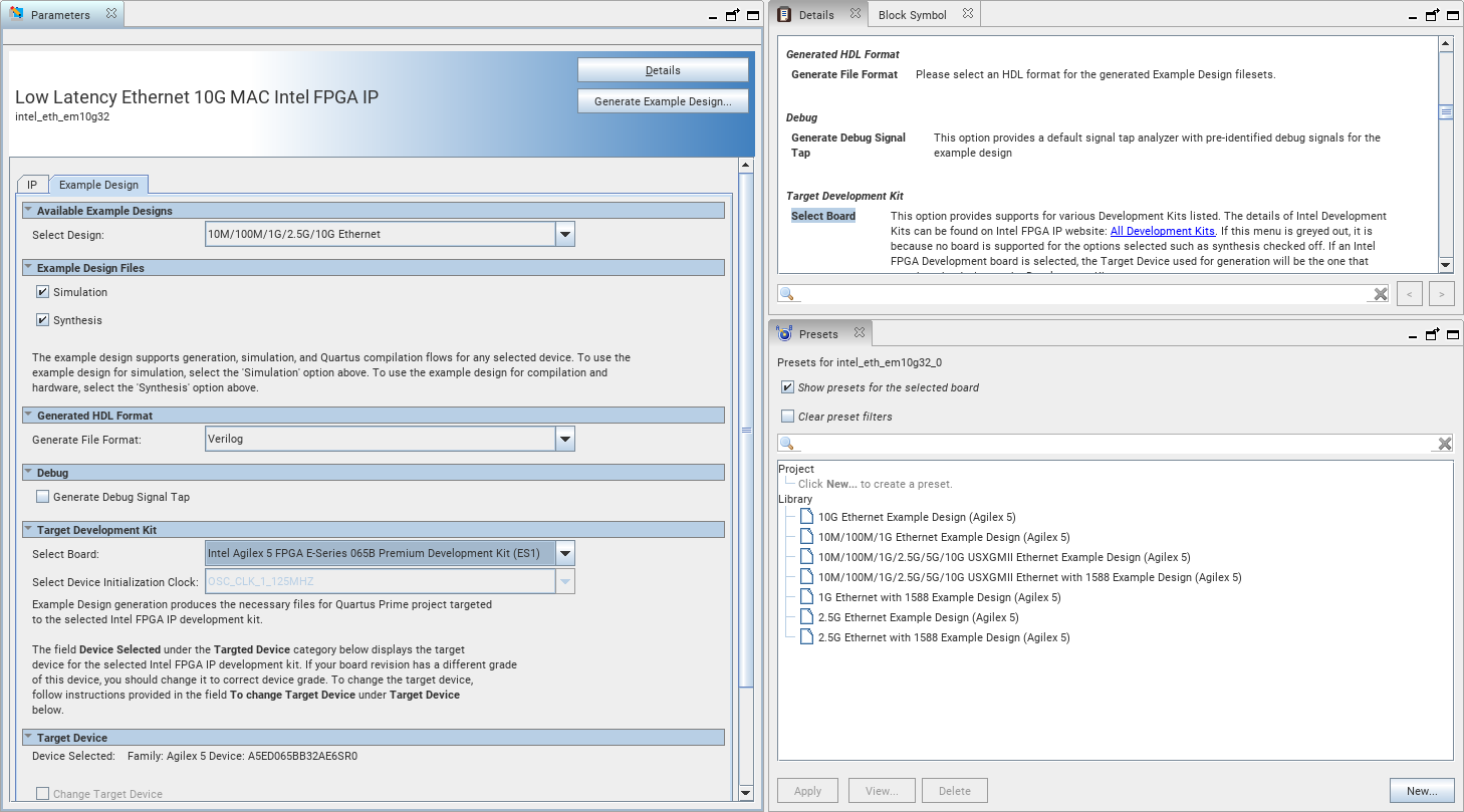 - To generate a design example, select a design example preset from the Presets library and click Apply. When you select a design, the system automatically populates the IP parameters for the design. The parameter editor automatically sets the parameters required to generate the design example. Do not change the preset parameters in the IP tab.
