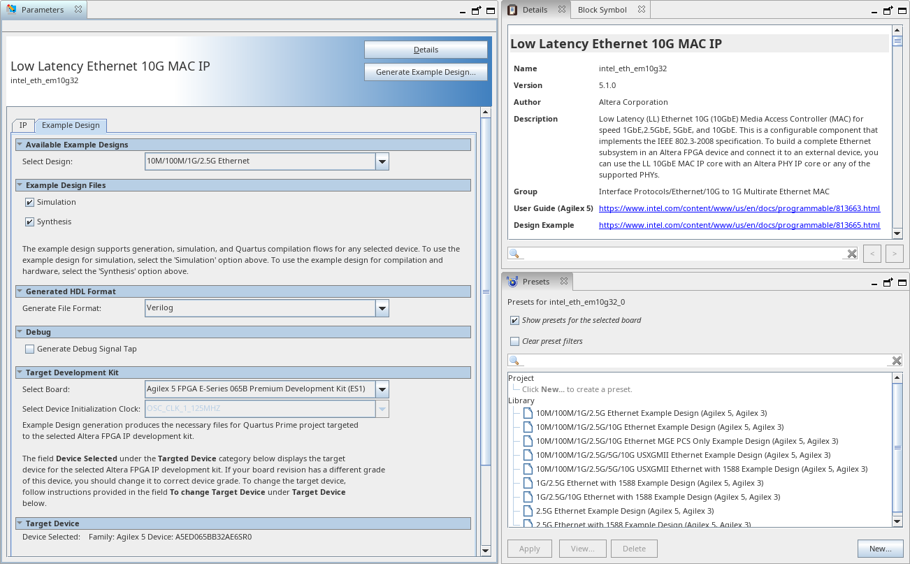 6. To generate a design example, select a design example preset from the Presets library and click Apply. When you select a design, the system automatically populates the IP parameters for the design. The parameter editor automatically sets the parameters required to generate the design example. Do not change the preset parameters in the IP tab.