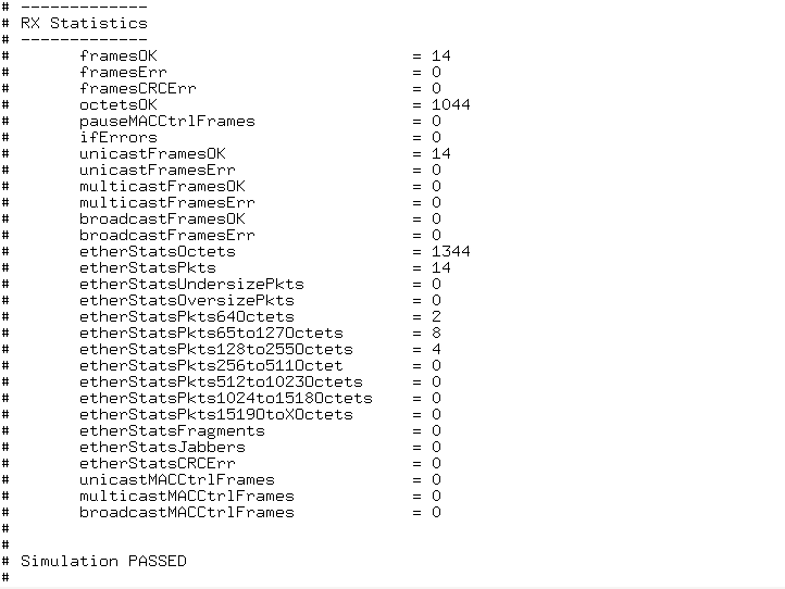 When simulation ends, the values of the MAC statistics counters are displayed in the transcript window. The transcript window also displays PASSED if the RX Avalon® streaming interface of channel 0 received all packets successfully, all statistics error counters are zero, and the RX MAC statistics counters are equal to the TX MAC statistics counters.