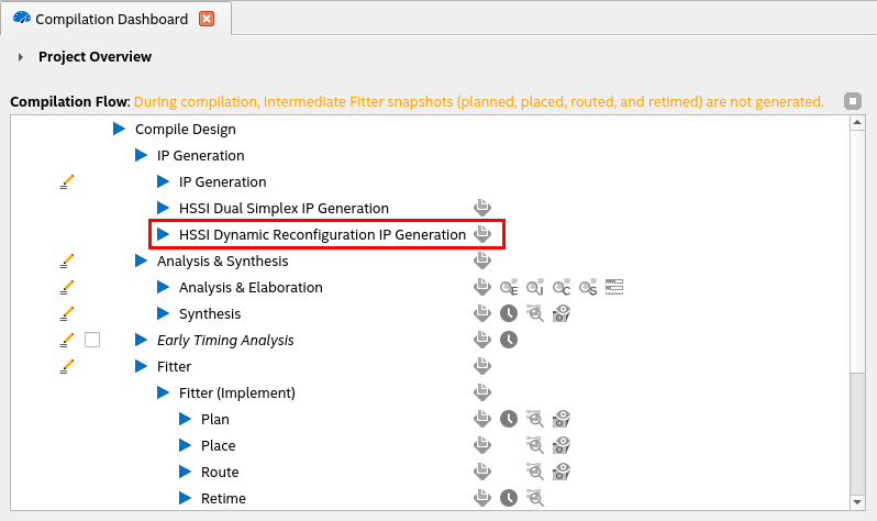 - Execute the HSSI Dynamic Reconfiguration IP Generation through the Quartus® Prime Pro Edition compilation dashboard as shown in figure below to generate the RTL for the DR group. This process utilizes the .ip file of the 1G/2.5G/5G/10G Multirate Ethernet PHY IP (mrphy_1g_2p5g.ip/mrphy_1g_2p5g_10g.ip) along with the project settings .qsf file to create the new top-level RTL file for DR group (mr_top.sv).