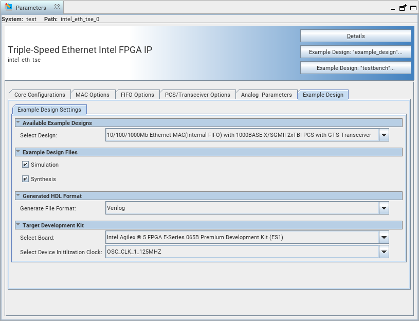 Figure 4. Example Design Tab in the Triple-Speed Ethernet Intel® FPGA IP Parameter Editor