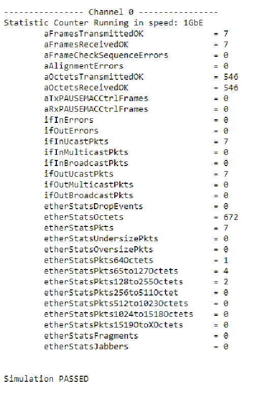 A successful testbench sends ten packets and receives the same number of packets. The following sample output illustrates the excerpt of the output: