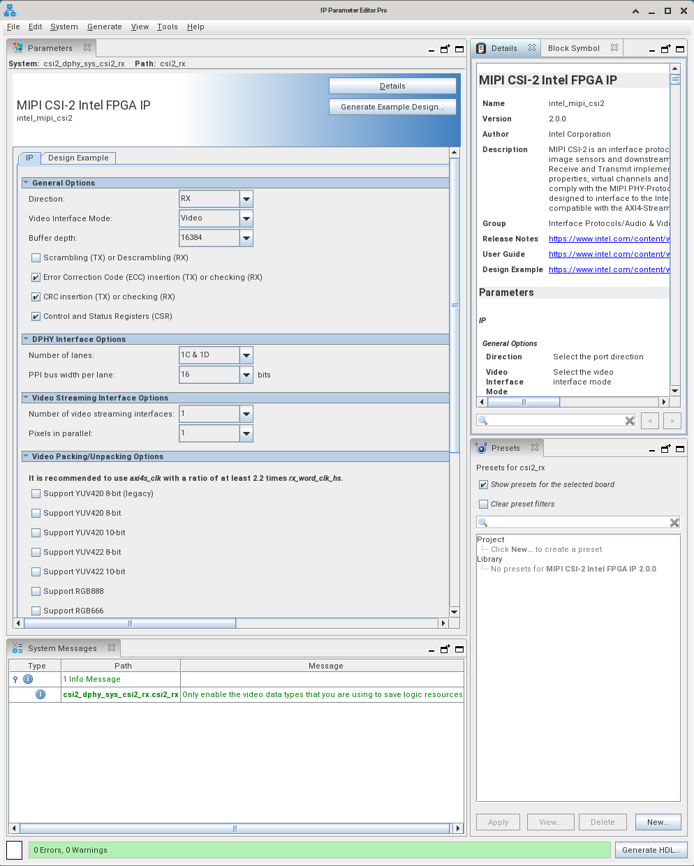 - Locate MIPI CSI-2 Intel FPGA IP. You may type some or all the component’s name in the IP Catalog search box to locate the IP. Double click on the IP.