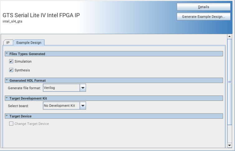 | File Types Generated | The IP generates the necessary design example files for simulation and compilation. Simulation—select this option to generate the necessary design simulation files. Synthesis—select this option to generate the necessary design synthesis files. Use these files to compile the design in the Quartus® Prime Pro Edition software for hardware testing. |