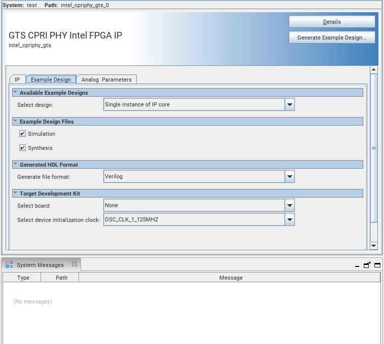 - If you want to modify the design example directory path or name from the defaults (intel_cpriphy_gts_0_example_design), browse to the new path and type the new design example directory name (<design_example_dir>).