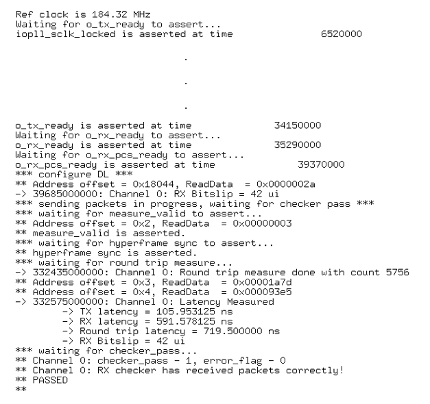 The following sample output illustrates a successful simulation test run for 10.1376 Gbps with 1 CPRI channel:
