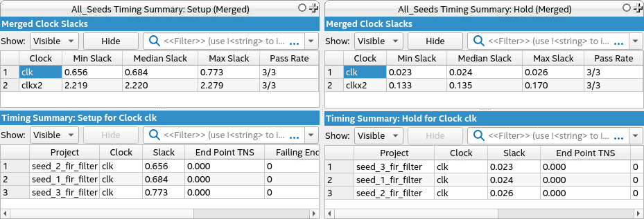 For each generated report—Setup, Hold, Recovery, or Removal—statistics are provided for each clock in the design. These statistics include Minimum, Median, and Maximum Slack, as well as the Pass Rate, which indicates the proportion of projects within the group that report positive slack, relative to the total number of projects. You can select a clock from the summary to show detailed information about the slack associated with each individual project.