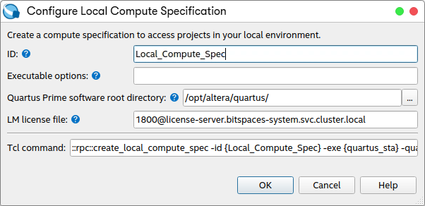 - Specify the ID, and retain the default values for the Quartus Prime software root directory and LM license file settings.