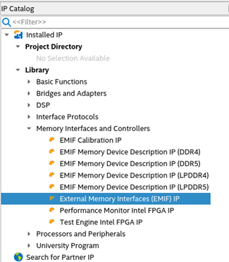 - In the IP Catalog window, select External Memory Interfaces IP. (If the IP Catalog window is not visible, select View > IP Catalog.)
