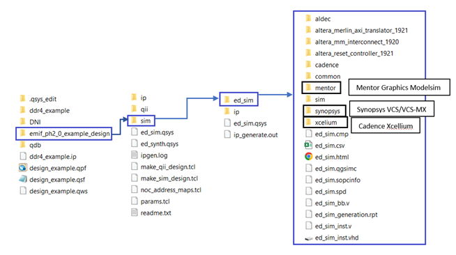 - Specify a directory for the EMIF design example and click OK. Successful generation of the EMIF design example creates multiple file sets for various supported simulators, under a sim/ed_sim directory.