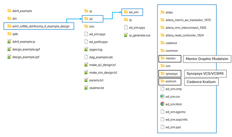 - Specify a directory for the EMIF design example and click OK. Successful generation of the EMIF design example creates multiple file sets for various supported simulators, under a sim/ed_sim directory.