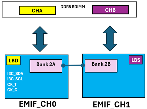 The above figure shows only I3C_SDA, I3C_SCL, CK_T, CK_C, LBD and LBS. To implement one DDR5 RDIMM (2 channel) interface, two adjacent IO 96B banks on the same side of the device are required.
