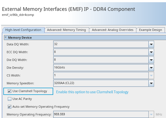 - Enable Use Clamshell Topology on the Memory Device section on the High-level Configuration tab.