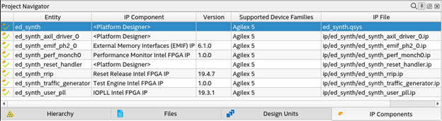 - Navigate to the IP Components tab in the Project Navigator, and click ed_synth.qsys to open the design in the Platform Designer.
