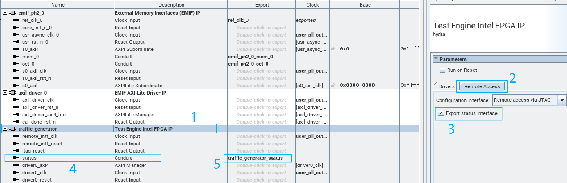 Using the Agilex™ 5 FPGA EMIF IP design example, perform the following steps to export the traffic generator traffic signals: