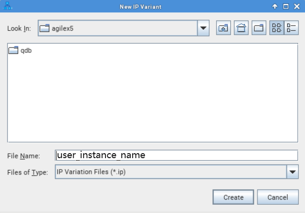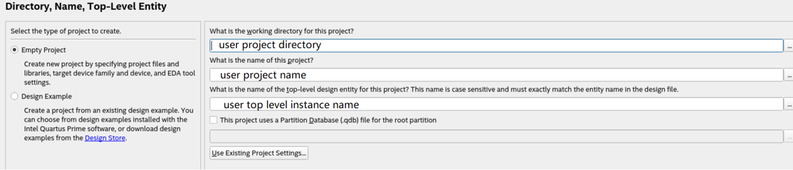 - Specify a directory (<user project directory>), a name for the Quartus® Prime project (<user project name>), and a top-level design entity name (<user top-level instance name>) that you want to create.