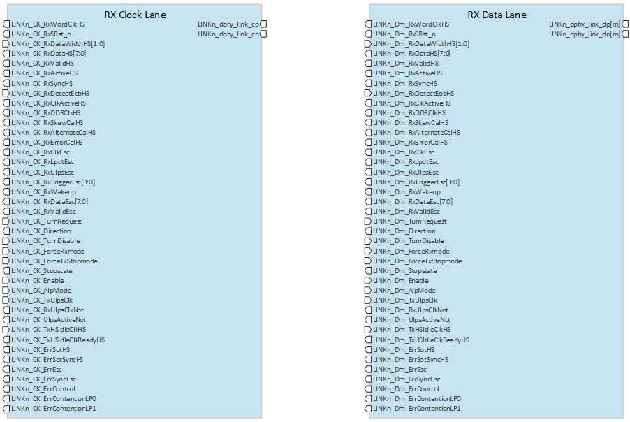 These PPI interface signals are used only when the D-PHY IP is configured for receive (RX). Each lane (clock and data) of each link has a PPI RX interface attached to it.