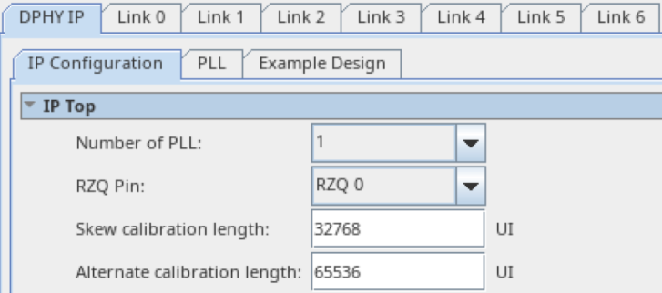 Alternate calibration length | Length of alternate calibration pattern automatically generated by D-PHY TX IP when ALT_CAL_EN = 1. This is done automatically after the init skew. When SKEW_CAL_EN = 0, protocol IP is responsible to drive TxAlTCalHS to generate alt cal sequence.ALT_CAL_LEN is ignored by D-PHY RX IP. | 65536 (This is the default value and the minimum.) |