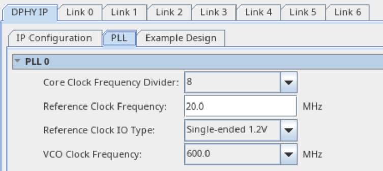 Number of PLL | Set number of PLL to use for clock generation. The IP can use up to 2 PLLs to share among the different D-PHY links. The bit rates of the D-PHY links has to be the same to share a PLL. | 1 or 2. (Default value is 1.) |