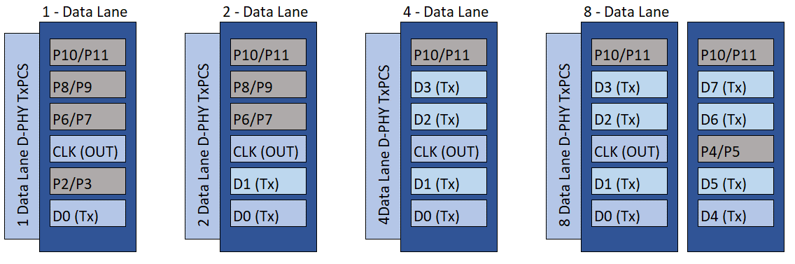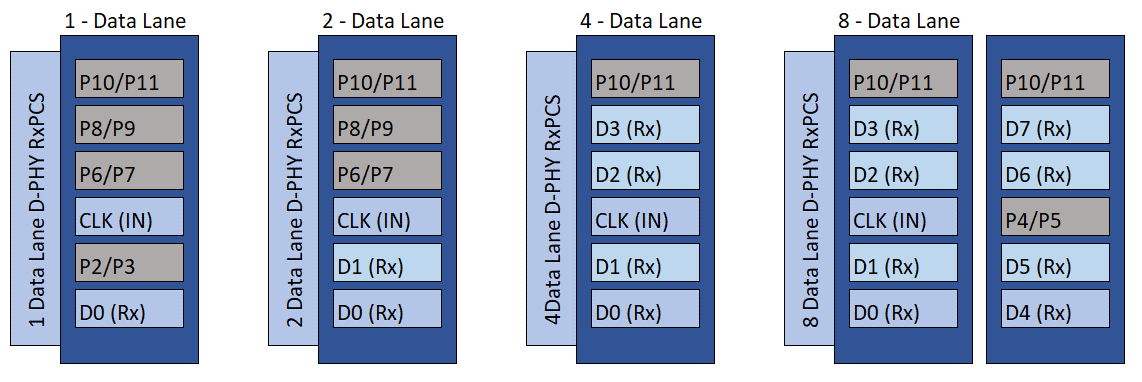Each interface has prefixed data lane and clock lane placement as illustrated in the diagram below. Refer to the MIPI D-PHY Interface Implementation section to understand the implementation and how to identify the physical pin placement.
