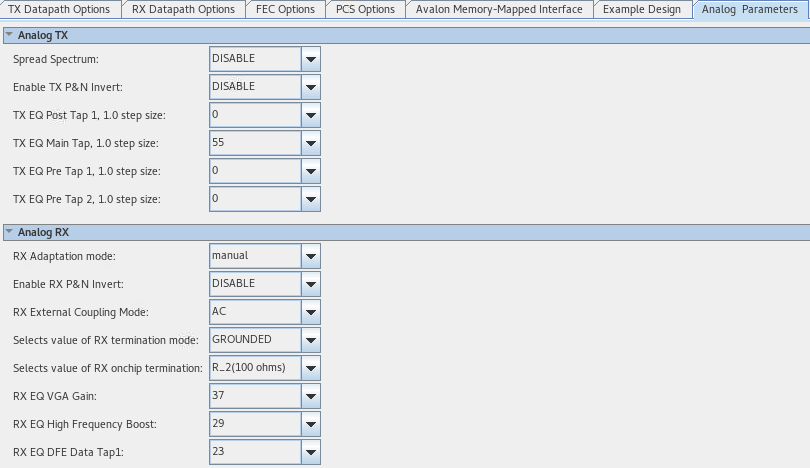 | RX Adaptation mode | auto/manual/native | Specifies the type of RX equalization mode. auto — Firmware based adaptation mode, also known as RX auto adaptation mode. manual — Firmware based adaptation is disabled. In this adaptation mode, you must configure and control the RX equalizer parameters such as VGA Gain, High Frequency Boost and DFE Data Tap 1 to tune the RX links in Analog Parameters tab of the IP GUI or in .qsf assignment file. You need to select the manual equalization mode if you are running at a data rate ≤ 7 Gbps. However, if you are running at a low data rate but the link is lossy, you may need to use the auto adaptation mode. native — the native adaptation mode must be enabled only for SDI, HDMI, and SAS modes configured in IP GUI for data rates above 7 Gbps. You do not need to set the RX equalizer parameters if you select this adaptation mode. Default value is auto. |