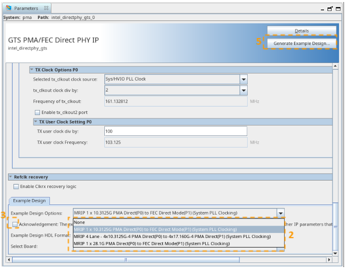 - Navigate to the Example Design section towards the end of the GTS PMA/FEC Direct PHY IP GUI. From the Example Design Options drop-down menu, select one of the Dynamically Reconfigurable PHY example design options that start with MRIP.