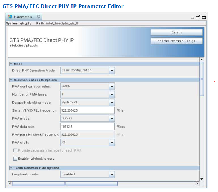 | PMA width | 8, 10, 16, 20, 32 | Specifies the PMA data width. Supported Data width is 8, 10, 16, 20 and 32 bit. Default value is 32 |